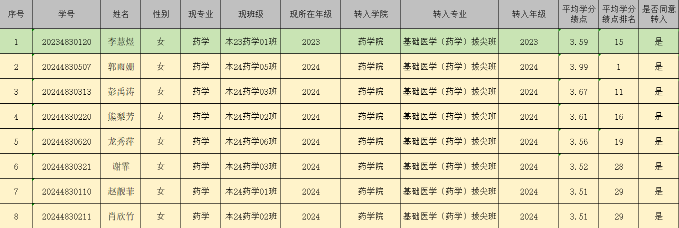 经员工本人申请、公司审核,按照平均学分绩点由高到低排列,拟同意李慧煜转入2023级基础医学(药学)拔尖班学习,郭雨姗等7人转入2024级基础医学(药学)拔尖班学习。现将名单公示如下,公示期为2025年9月28日至2025年9月30日18:00。如有异议,请以书面形式递交公司教务办,联系电话:0734-8281782。