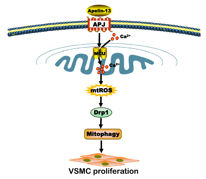 该团队2018年发现,PINK1/parkin信号诱导的线粒体自噬是Apelin-13/APJ促进血管平滑肌细胞(VSMCs)增殖的新机制,阐明了Apelin-13/APJ促进动脉粥样硬化(AS)的新机理;同年,团队还报道Apelin-13可通过Warburg效应诱导人主动脉血管平滑肌细胞(HA-VSMCs)增殖的新机制;2022年,团队进一步报道,线粒体钙单转运蛋白(MCU)依赖的线粒体Ca⟡⁺摄取和线粒体自噬参与了Apelin-13诱导的HA-VSMCs增殖。因此,Apelin/APJ系统有望成为未来动脉粥样硬化(AS)新的潜在治疗靶点。