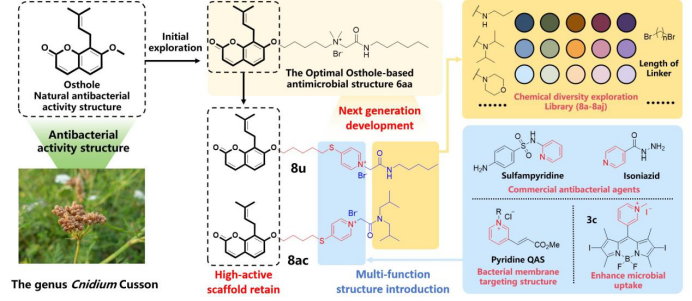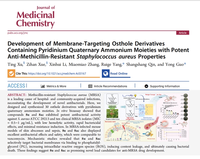 郭勇和杨瑞阁教授团队前期基于天然产物蛇床子素设计合成一类两亲性蛇床子素类衍生物,并从中发现6aa具有良好的抗MRSA活性和低耐药性,但与万古霉素相比体内抗菌作用仍有待提升(Eur. J. Med. Chem.2024, 271, 116449.)。为此,课题组基于6aa的结构进行了迭代优化,保留原有结构设计的基础上引入活性基团吡啶季胺盐,以期改善其抗菌活性,最终制备了一系列吡啶季铵盐蛇床子素衍生物,并优选出两个高活低毒衍生物8u和8ac。8u和8ac在4 mg/kg剂量下,在MRSA感染的小鼠皮肤脓肿模型中,表现出优于万古霉素的治疗作用。更重要的是,8ac在系统性感染脓毒症模型中也表现出与万古霉素相当的抗菌效力。同时机理研究揭示出衍生物8u和8ac通过选择性结合细菌细胞膜上的PG,造成细菌细胞膜破裂,发挥快速杀菌作用和低耐药性。这项研究工作中所开发的衍生物8u和8ac具有优异的体内外抗菌活性,对开发新型抗菌药物,解决细菌耐药性问题具有重要意义。研究结果发表于J.Med. Chem.,2025,https://doi.org/10.1021/acs.jmedchem.4c03167,中科院1区TOP)。