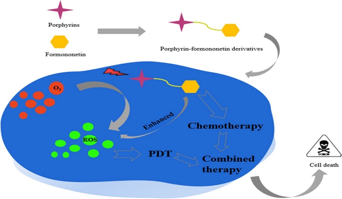 研究显示,通过共价键将卟啉与芒柄花素连接,可显著增强ROS量子产率并实现PDT与化疗的双重效应(如上图)。其中,锌金属化衍生物6c表现尤为突出,其ROS量子产率较母体卟啉提升40%,对前列腺癌细胞DU145的半数抑制浓度(IC50)低至20.44 μmol/L(光照条件),且对正常心肌细胞H9C2的毒性显著低于阳性对照药物5-FU。该论文首次将卟啉类光敏剂与天然化合物芒柄花素相结合,为以后开发光动力治疗与化疗的联合治疗提供了理论研究基础。
