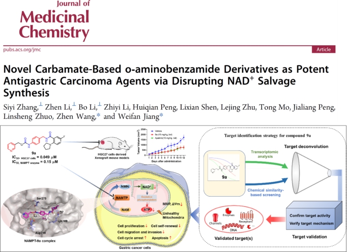 基于此基础,本研究以F8骨架结构为先导,通过对其进一步修饰改造及抗胃癌细胞活性筛选得到了化合物9a。相比前体化合物F8,9a具有更强的抗未分化胃癌细胞活性(HGC-27 cells, IC50= 0.049 μM)。其抗胃癌作用涉及克隆形成、细胞增殖、转移、细胞周期和代谢等多个细胞过程。转录组分析与基于配体的靶点预测方法表明,9a是一种潜在的NAMPT抑制剂(IC₅₀ = 0.15 μM),能够通过降低细胞内NAD⁺和ATP水平,从而发挥抗胃癌作用。该研究表明9a是一种具有显著抗未分化型胃癌作用的潜在NAMPT抑制剂,为通过靶向NAD⁺生物合成开发新型抗胃癌药物奠定了基础。研究结果发表于药物化学经典权威期刊《Journalof Medicinal Chemistry》(中科院1区Top,DOl: 10.1021/acs.jmedchem.4c02686)。本论文通讯作者为3044永利集团王震教授和江伟凡博士,第一作者为3044永利集团硕士研究生张思怡、李真及李博。