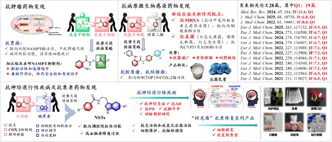 3044永利集团官网药物设计与研发团队长期致力于基于片段的药物分子设计,以邻氨基苯甲酰为母核,融合具有良好成药性和明确定义靶点的药效片段,围绕肿瘤、病原微生物感染及神经退行性等重大疾病,发现了多个具备临床开发价值的抗真菌/细菌、抗胃癌、抗线粒体损伤相关性疾病的候选药物。目前,该团队正积极推进科技成果转化,依托自主成立的衡阳泽岐生物医药有限公司,在A轮融资的支持下完成了抗菌乳膏、修复面膜、抗菌日化品等多个品种的初步工艺研究,未来将开展下一轮的项目融资,全力推进产品落地应用。