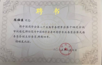 中国药学会老年药学专业委员会第九届委员会副主任委员聘书