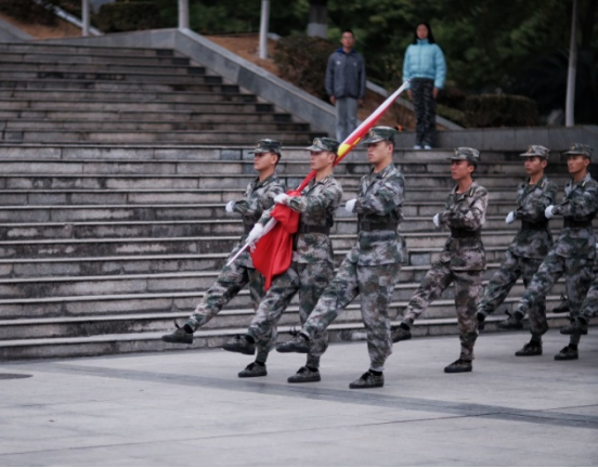 早晨七时零分,升旗仪式正式开始,旗手高举国旗,昂首阔步,领着国旗班成员迈向升旗台,在同学们严肃而庄重的目光下,在嘹亮的国歌声中。鲜艳的五星红旗冉冉升起,飘扬在南华广场上。