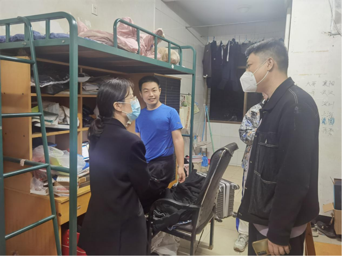 在走访过程中,陈健平以及各年级辅导员与同学们进行了亲切交流,全面了解同学们疫情防控期间的学习、论文撰写、就业、日常生活等情况,叮嘱同学们要严格遵守疫情防控期间公司的各项管理规定,非必要不出宿舍,同时要认真做好个人防护和自我管理,养成良好的生活卫生习惯,按时参加公司组织的核酸检测,加强身体锻炼,注意身体健康,以阳光积极的心态、健康的体魄抗击疫情。