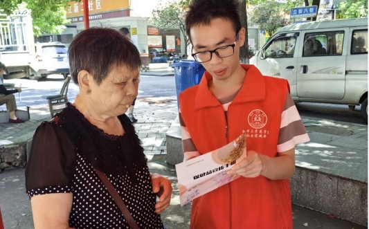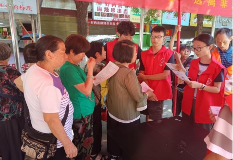 志愿者在社区街道给居民普及常见保健品诈骗手段