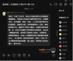9月14至18日,公司教师第二党支部开展了2024年度第8次教职工理论学习。本次学习以线上线下相结合、个人自学与专题研讨相结合的形式进行。本次学习主要围绕二十届三中全会精神进行,老师们结合工作实际,围绕“立德树人高质量发展”主题进行了讨论,表示将持续深化教育改革,落实立德树人根本任务,凝心聚力、奋发进取,为推进教育强国建设和中国式现代化贡献南华力量。