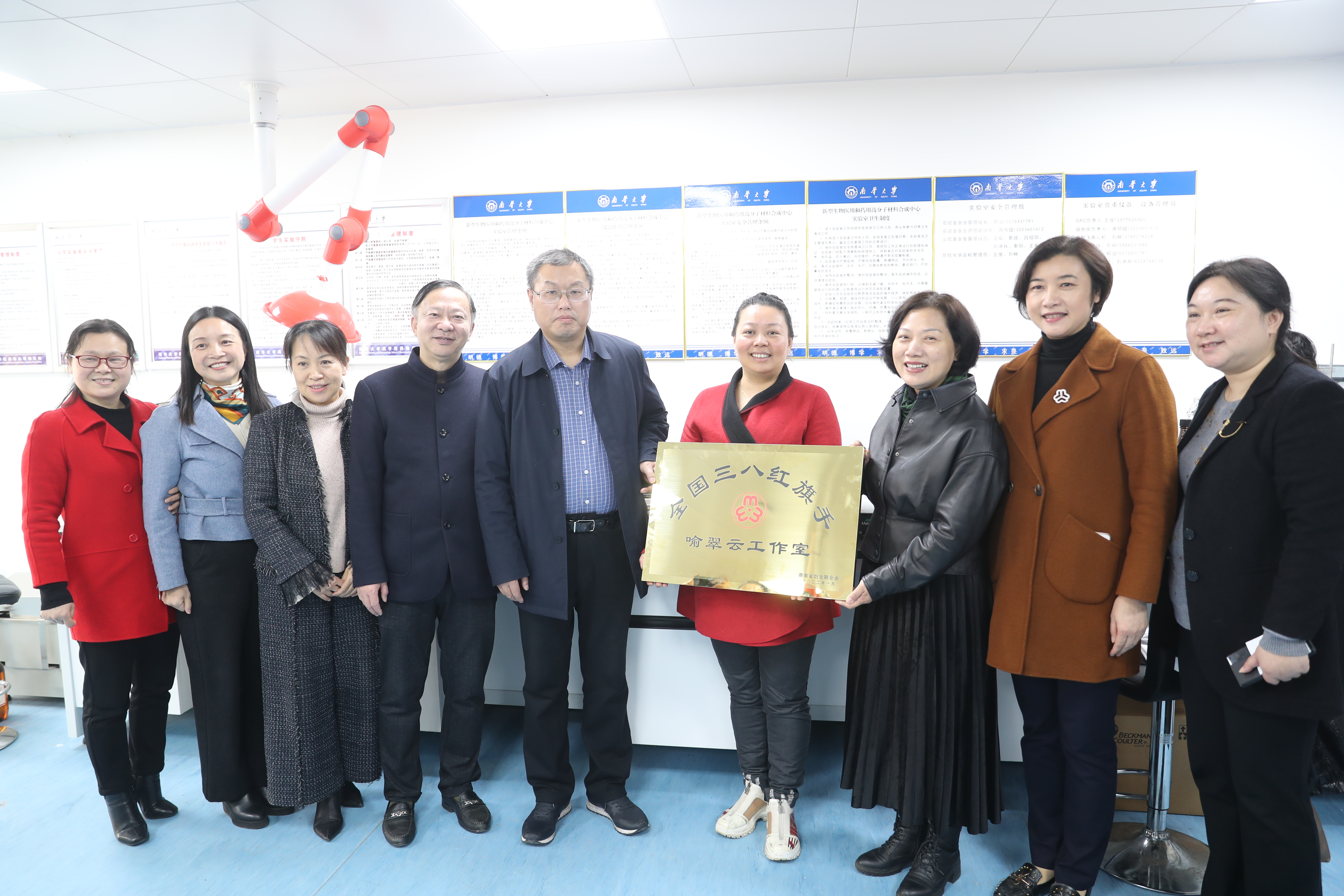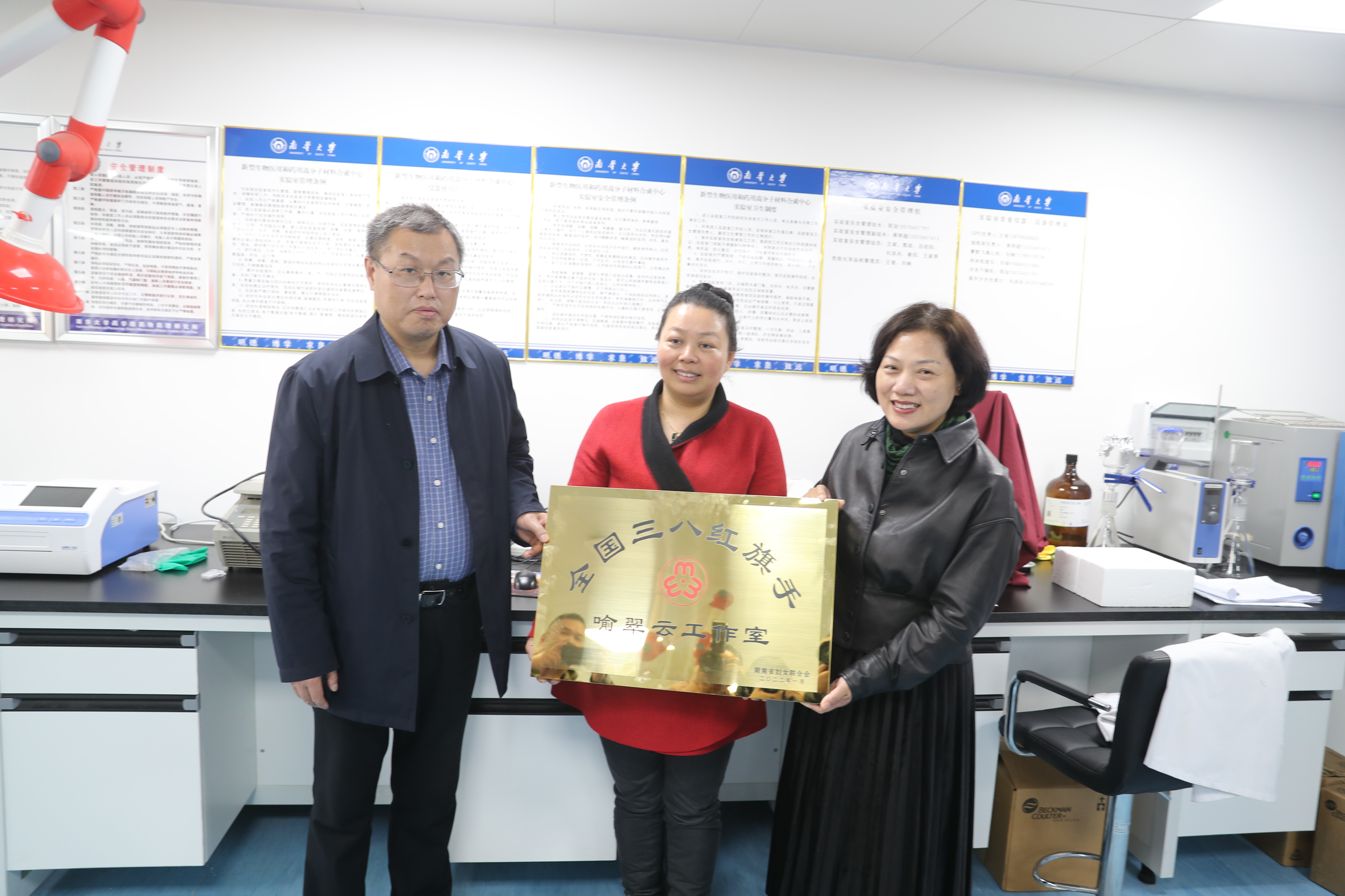 3月3日上午,全国三八红旗手喻翠云工作室授牌仪式在3044永利集团官网医研楼五楼举行,省妇联副主席卢妹香、3044永利集团官网副董事长姜志胜共同为喻翠云授牌——“全国三八红旗手喻翠云工作室”,出席仪式的还有市妇联党组书记、主席谌惠渝,市妇联党组成员、副主席龙华、 廖朝霞,及3044永利集团官网工会常务副主席潘本衡、药公司党委书记袁中华、经理喻翠云等相关部门人员。